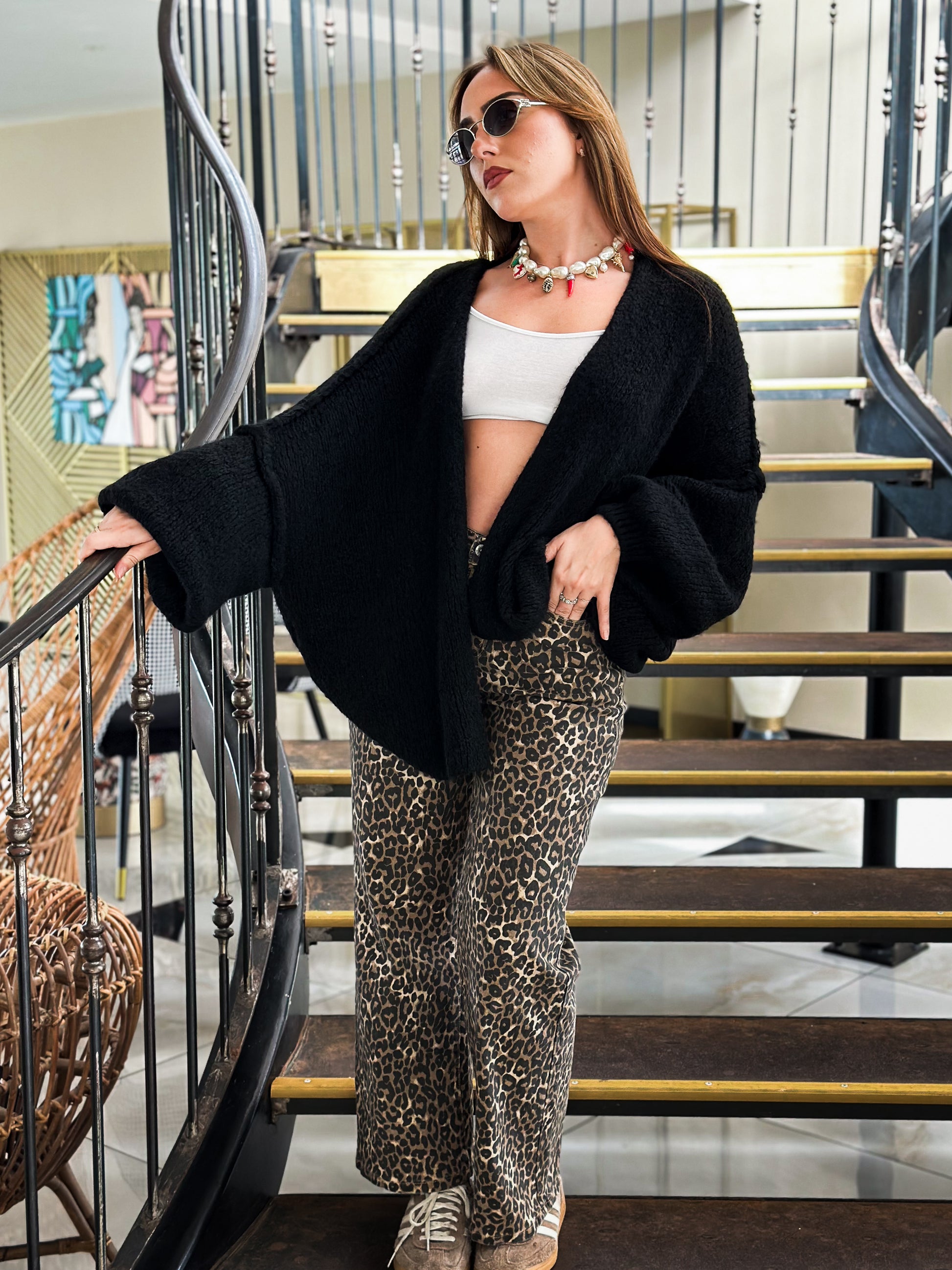 - Sur la photo : la modèle porte le gilet Stella noir avec le Jean Vittoria léopard et mesure 1m60.