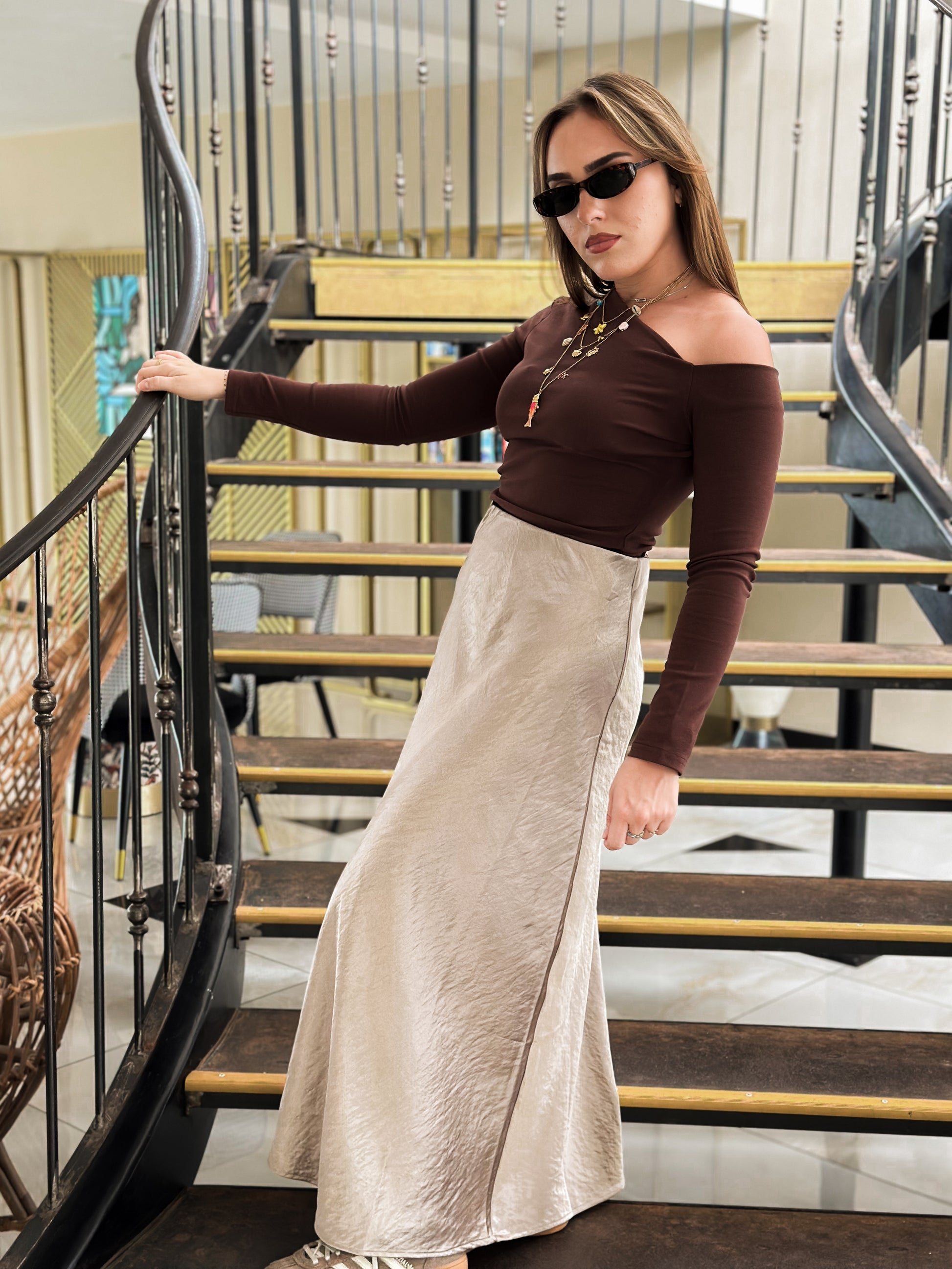 La jupe Alma en coloris champagne est la pièce chic et intemporelle qui sublime instantanément la silhouette. Sa matière satinée lourde tombe naturellement pour un rendu élégant, sans coller aux jambes ni marquer les formes. Avec sa taille élastiquée ultra confortable, elle s’adapte facilement et se porte aussi bien en journée qu’en soirée.